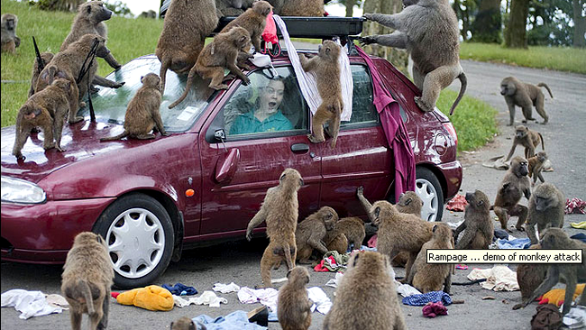Ei bine, cel mai bine este sa stai cuminte in masina, asa cum au facut-o si vizitatorii unui parc safari din Merseyside (Anglia), care au fost surprinsi de un atac rapid al babuinilor rezidenti in locul amintit.