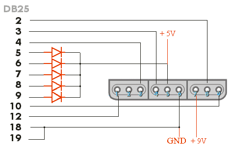 Trebuie respectata urmatoarea schema. Luam mufa DB25 si ii lipim diodele pe pinii 5, 6, 7, 8 si 9, astfel incat curentul sa nu poata trece decat din PC spre PAD, si nu… invers. Acum trebuie sa facem conexiile propriu-zise, ceea ce nu ar trebui sa constituie o problema.