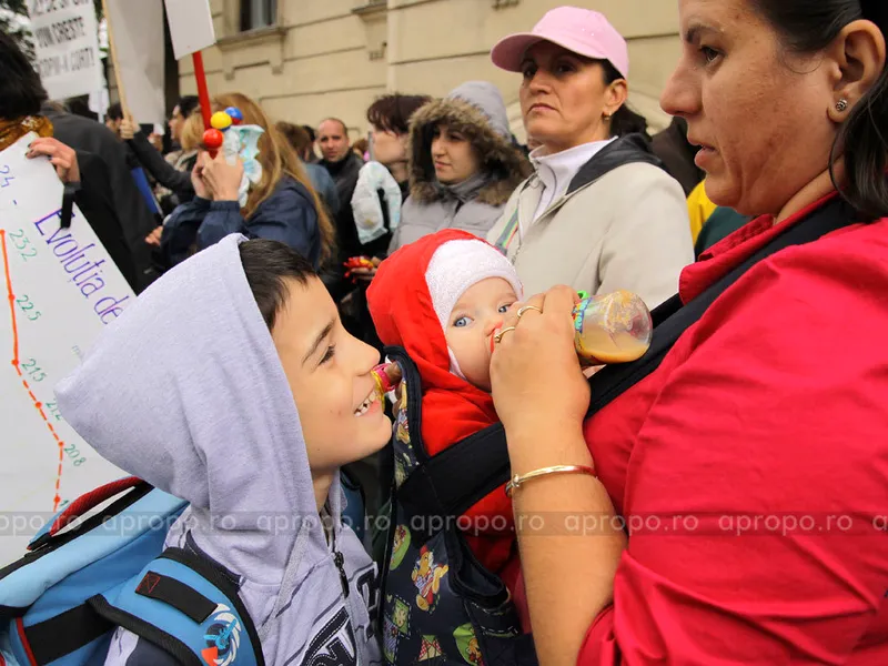 POZA ZILEI: Parintii au „luptat” cu bebelusi si pampersi folositi, pentru salvarea indemnizatiei