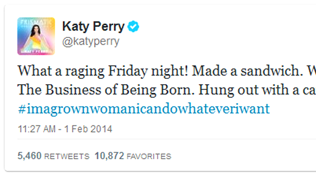 Katy Perry urmărește doar 132 de persoane și a postat luni, pe contul ei de Twitter, recordul pe care l-a înregistrat.