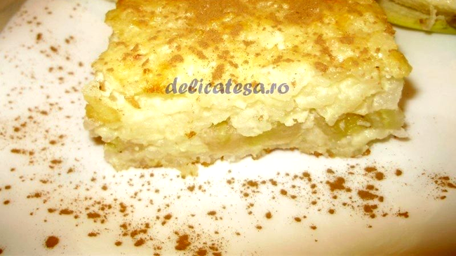 Se fierbe orezul cu laptele și un praf de sare. Se separă albușurile de gălbenușuri, iar albușurile se bat spumă. Când orezul este aproape fiert, se pune zahărul și zahărul vanilat. Se mai fierbe puțin pentru a se dizolva zahărul. Se ia de pe foc, se lasă să se răcorească puțin, apoi se adaugă gălbenușurile pe rând, amestecând bine. Se încorporează în amestecul de orez și spuma de albușuri. Într-o tavă unsă cu unt se toarnă 1/2 din cantitatea de orez, se pune un rând de banane tăiate rondele, apoi restul de orez. Se dă 30 de minute la cuptor, până se rumenește frumos. Deasupra se presară scorțișoară. Se pot folosi și alte fructe, după dorință.