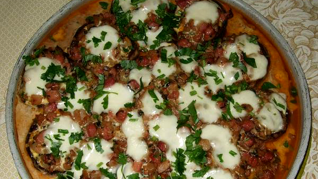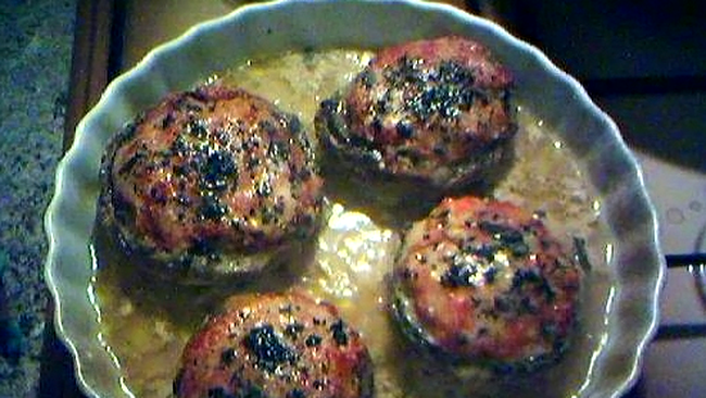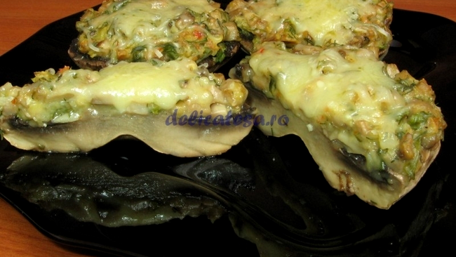Se curăță ciupercile, se spală bine, se scobesc puțin dacă sunt mai groase, se separă piciorul și se tăie împreună totul mărunt. Se pune într-un castron cu carnea tocată, pătrunjelul și usturoiul tocat, oul, sare și piper (dacă dorim). Cu această compoziție se umplu ciupercile, se pune o linguriță cu sos de roșii deasupra, se presară parmezan sau cașcaval, se presară oregano și pătrunjel, se pune o lingură de ulei pe fiecare ciupercă și se dau la cuptorul încălzit bine. În 20-30 de minute sunt deja gata. Se poate servi ca aperitiv sau felul doi.