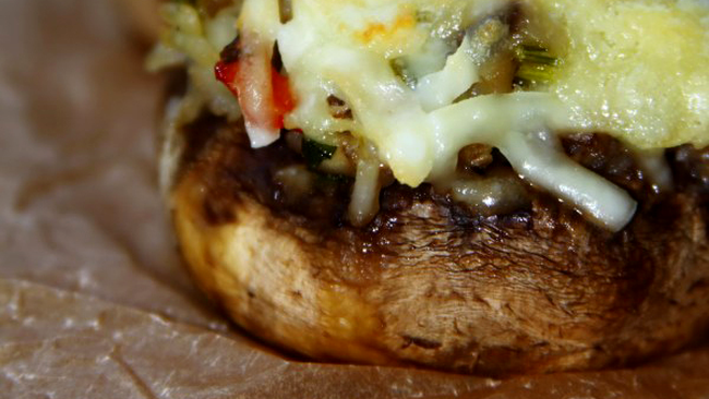 Ciupercile se spală bine și se rupe piciorușul – nu curățați ciupercile de pielița de pe pălărie. Se lasă la uscat pe un șervețel absorbant cu puțină sare aruncată peste ele. Piciorușele se spală bine și se toacă mărunt. Ceapă roșie și ardeiul kapia se toacă mărunt și se călesc cu piciorușele de la ciuperci în puțin ulei de măsline. Opțional se pot adauga câteva rondele de ardei iute. Se aruncă un praf de sare, piper și boia de ardei dulce. Legumele nu se călesc foarte mult, doar până prind o nuanța lucioasă. Într-o tavă se pune hârtie de copt care se șterge cu un șervețel îmbibat în ulei de măsline, să nu se lipească ciupercile când sunt la cuptor. Umpleți ciupercile cu legumele călite, însă nu prea mult pentru că trebuie să lăsați loc și pentru cașcaval. Pentru cine dorește, înainte să pună legumele în ciuperci poate să mai pună un praf de sare sau de piper. Se adaugă și cașcavalul deaupra la ciuperci și se dau la cuptor pentru 30-40 de minute la foc mediu spre mic. Ciupercile umplute la cuptor trebuie să se coacă la foc mic. În funcție de cum va place le puteți ține mai mult la cuptor sau mai puțin. Se servesc că atare sau cu brânză dulce lângă.