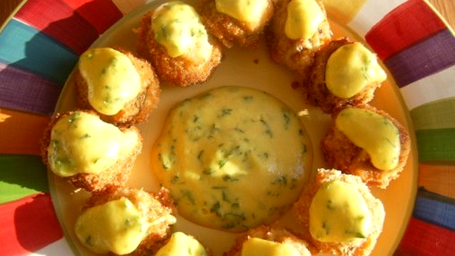 Somonul afumat se tăie în bucăți mărunte, iar ciupercile se curăță de învelișul exterior, apoi se dau cu puțină sare, acest lucru făcând că ele să se înmoaie mai repede. Se umple apoi cavitatea interioară a fiecărei ciuperci cu somonul afumat mărunțit. Separat, se bate un ou cu puțină apă, sare și piper. Apoi se trece fiecare ciupercă prin ou bătut și prin pesmet, aflat separat, în alt vas. Ciupercile se pun apoi la prăjit în uleiul încins, cu cavitatea interioară umplută cu somon în jos. Se acoperă tigaia cu un capac și se lasă la prăjit pentru 7 sau 8 minute. Se scot apoi pe un șervețel de bucătărie, se curăță bine uleiul, apoi se tăie în două, obținându-se două jumătăți de ciupercă umplută cu somon afumat.