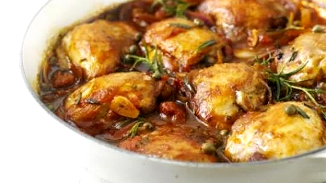 Se încinge cuptorul la 200 grade C / gaz 6. Se unge puiul cu două linguri de ulei, se așează într-o tavă încăpătoare și se dă la cuptor 15 minute. Între timp, se încălzesc două linguri de ulei într-o tigaie și se călesc ceapa și rozmarinul, 5-10 minute, până când ceapa se înmoaie. Se reduce temperatura cuptorului la 180 grade C / gaz 4. Se adaugă peste pui roșiile din conservă, ceapa cu rozmarinul, oțetul, zahărul, supa. Se asezonează cu sare și piper proaspăt râșnit. Se da tava din nou la cuptor, 40-50 de minute, până când puiul este fraged – se verifică una dintre pulpe, pentru că acestea se fac mai greu. În ultimele 10 minute se adaugă ciupercile. La final se amestecă pătrunjelul, dacă se folosește, apoi se servește puiul cu piure, paste sau cu pâine prăjită cu usturoi.