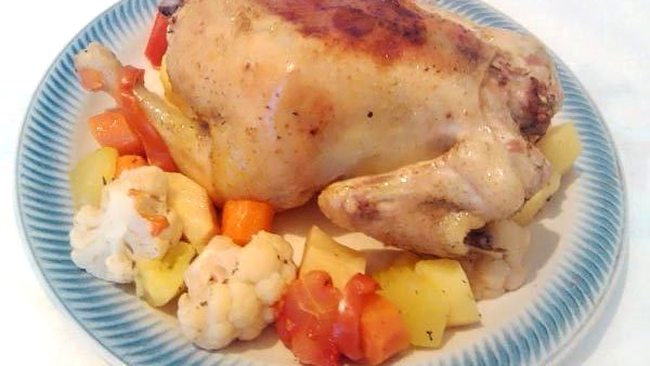Puiul spălat și curățat bine și frecat cu sare, piper și boia iute l-am pus într-o tavă cu puțină apă și l-am dat la cuptor pentru 1 oră, în această perioadă întorcând puiul cel puțin odată. Între timp am pregătit legumele, curățându-le, spălându-le și tăindu-le bucăți potrivite. Lângă puiul rumenit am pus legumele și am dat iar la cuptor pentru 30-40 de minute. Roșia am tăiat-o rondele și am așezat-o deasupra legumelor, iar când puiul s-a rumenit frumos și legumele au fost gata am oprit focul. Am servit puiul alături de legume și murături.