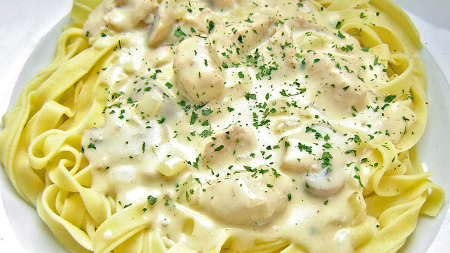 Se curăță pieptul de pui de pielițe, se spală și se condimentează cu sare și puțin piper alb. Se unge cu unt și se pune o cană cu apă, apoi se bagă la cuptor acoperit cu un capac. Într-o crăticioară se topește untul, se pune făina și se stinge cu laptele călduț, amestecându-se continuu să nu se formeze cocoloașe. Se mai lasă câteva minute să fiarbă. Separat, se rade cașcavalul pe răzătoarea mică și se pregătesc stafidele. Se spală în 2-3 ape și se pun în sosul béchamel. Se curăță usturoiul, se crestează la capete sau se taie mărunt și se pune peste pieptul de pui. Se scoate pieptul din cuptor, se taie bucățele mici, se toarnă sosul béchamel, cașcavalul ras și se mai lasă câteva minute să facă crustă. Se scoate și se ornează cu rozmarin și se servește cald cu paste.