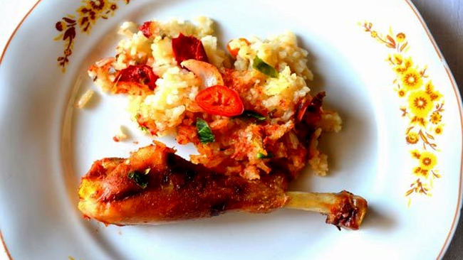 Am luat grăsimea de pe pulpe și am făcut din ea puțină supă. E de preferat să folosim supă de pui la această mâncare deoarece așa va ieși mult mai gustoasă. Dacă nu aveți și nici nu vreți să faceți puteți să folosiți apă, însă puiul meu fiind de casă am putut să fac foarte ușor supă din grăsimea lui. Orezul l-am spălat bine și l-am amestecat cu ardeiul tăiat feliuțe și ceapa tăiată mărunt și am condimentat cu sare, piper și boia. Am pus orezul într-o tavă și deasupra am pus carnea de pui. Am turnat supă și bulionul și am presărat pătrunjel. Am dat vasul la cuptor la 170 de grade până când orezul a fost fiert și carnea pătrunsă. Din 2 căni de orez iese o cantitate suficientă de mâncare pentru 4 persoane. Reduceți din orez dacă doriți să gătiți doar pentru 2 persoane sau doar pentru ziua respectivă.