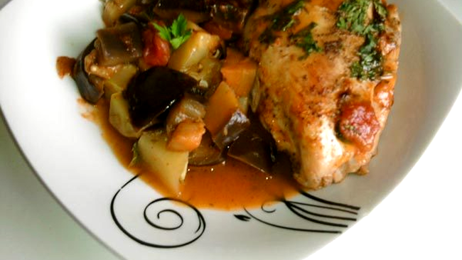 5. Pui la cuptor cu vinete, zucchini și roșii