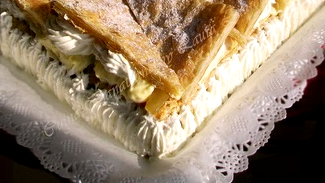 Amestecul de mere, fierbinte, se împarte pe două dintre foile de foietaj, păstrând-o deoparte pe cea mai aspectuoasa. 1,2 litri de lapte se pun la fiert. Gălbenușurile se amestecă cu restul de zahăr (300 de grame) și făină, se diluează cu cei 100 de mililitri de lapte ce au rămas și se adaugă peste laptele fierbinte, amestecând cu grijă până când fierbe și se îngroașă. Se adaugă esența de vanilie și se lasă cremă deoparte, acoperită cu o folie alimentară, până când se răcește.