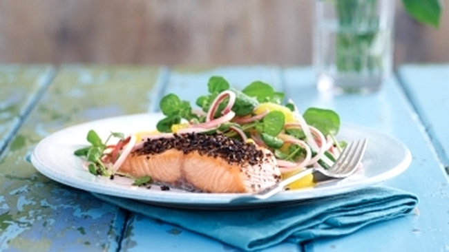 Pentru salată se curăță coaja portocalei cu un cuțit, mai întâi capetele, apoi marginile, de jur împrejur, până rămâne doar pulpa, fără pielița albă. Apoi, deasupra unui bol (ca să nu se piardă sucul) se rupe cu grijă în felii (încearcă să le desprinzi în dreptul membranei). Se adaugă rubarba și se lasă deoparte 15 minute. Între timp, se zdrobesc grosier boabele de piper și de ienupăr folosind un mojar cu pistil. Se așează somonul pe o hârtie de copt, se masează cu ulei, apoi se presară condimentele. Se încălzește grillul la treapta medie și se coace somonul 6-7 minute, având grijă ca stratul de condimente să nu se ardă. Pentru a termina salata, se adaugă năsturelul și uleiul de măsline peste rubarbă și portocală, se amestecă bine și se servește alături de somon.