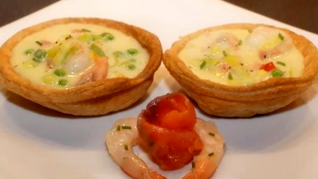 Somonul în scoici din aluat franțuzesc este un aperitiv cu pește deosebit care poate fi servit la orice ocazie festivă. Pentru această rețetă cu somon se toacă mai întâi prazul tocat și ardeiul gras, după care se călesc un pic în unt. Se adaugă 2 linguri cu făină, puțin praf de curry, sare și piper după gust și apoi laptete. Se fierbe totul la foc mic până se îngroașă sosul, iar spre final se adaugă mazărea (fiartă în prealabil), creveții curățați, bucățile de somon afumat și se mai lasă 2 minute pe foc. Cu această pastă se umplu scoicile din aluat care au fost coapte dinainte. Somonul în scoici din aluat franțuzesc se pune la rece înainte de a fi servit, dar poate fi consumat și cald.