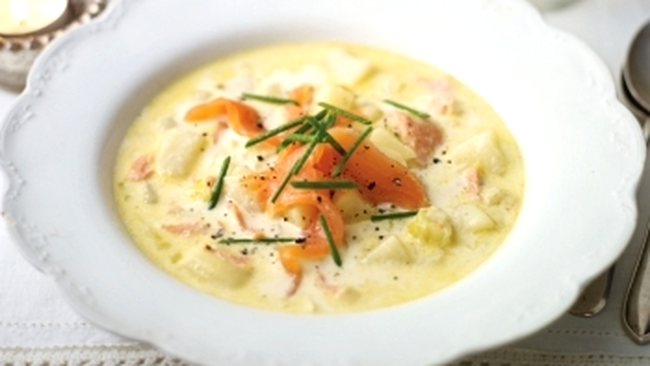 Se încălzește untul într-o cratiță mare și se adaugă prazul și frunza de dafin. Se prăjesc la foc mic 8-10 minute sau până când prazul este foarte moale, apoi se adaugă cartofii și se amestecă până când sunt înveliți în unt. Se toarnă supa și smântâna și se fierbe totul la foc mic 10-15 minute, până când cartofii sunt foarte fragezi. Se adaugă două treimi din somonul afumat, se amestecă și se asezonează. Se servește supa în boluri adânci, folosind somonul rămas și chives tocat ca topping.