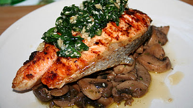 Se încălzește cuptorul 190 (grade C). Se așează peștele într-o tavă unsă. Spanacul se spăla bine și se tăie cu cuțitul nu foarte mărunt. Roșia se spăla și se tăie în jumătate, se scoate miezul afară, după care se tăie bucățele. Ciupercile se curăță și se tăie codițele, după care se tăie felii. Din ulei și oțet sau zeamă de lămâie se face un dressing ca și pentru salată, se pune sare, piper, busuioc uscat și alte mirodenii, după preferința. Dressingul se toarnă peste spanac, roșie și ciuperci și se amestecă bine. Compoziția obținută se pune peste somon. Se pune la cuptor 20 – 25 de minute. Se servește cu orez fiert.