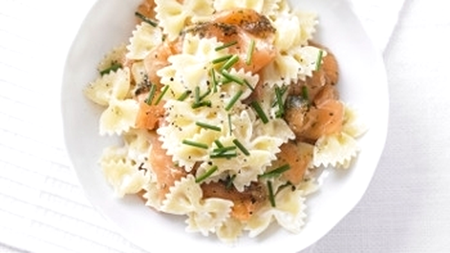 Prepară pastele conform instrucțiunilor de pe pachet. Scurge-le, păstrând puțină apă și pune-le înapoi în cratiță. Adaugă brânza, zeama de lămâie, somonul și puțin piper și amestecă bine. Adaugă puțină apă de la paste pentru a lega sosul și amestecă. Adaugă cea mai mare parte din chives, amestecă și împarte pastele în farfurii. Servește cu firele de chives rămase presărate deasupra.