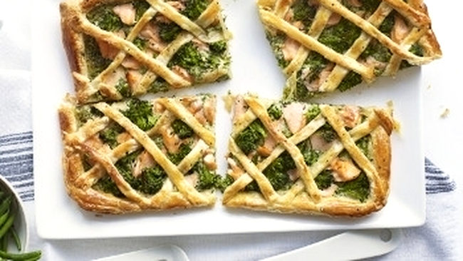 Fierbe broccoli într-o cantitate suficientă de apă clocotită, până devine fraged – aproximativ 4 minute. Scurge-l și clătește-l cu apă rece. Într-un robot de bucătărie mic sau cu un blender vertical, amestecă năsturelul și crème fraîche (smântâna de gătit), apoi asezonează. Încinge cuptorul la 200Ëš C/gaz 6. Desfă pachetul de aluat de foitaj și așează o foaie pe o hârtie de copt. Taie o margine de 2 cm lățime din cea de-a doua foaie de aluat, ca o ramă foto, și lipește această margine de prima foaie cu puțin ou bătut. Înțeapă din loc în loc aluatul cu o furculiță și dă-l 10 minute la cuptor. Taie restul de aluat în fâșii de 2 cm lățime. Peste aluatul scos din cuptor pune smântâna, presară somonul, broccoli și asezonează, apoi așează fâșiile în așa fel încât să arate ca un grilaj. Unge fâșiile de aluat cu ou bătut și coace 20-25 de minute până când tarta este aurie și pătrunsă, iar umplutura este fierbinte. Servește cu mazăre.
