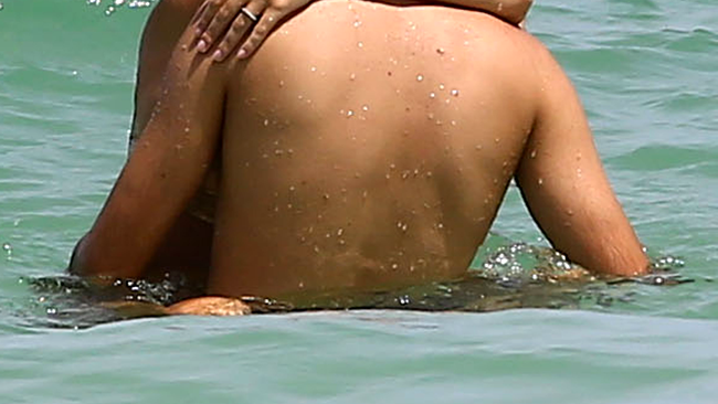 După ce, zilele trecute, şi-a uitat sutienul pe plajă şi a fost pozată în sânii goi, ieri, vedeta le-a oferit imaginea zilei, în timp ce se afla pe o plajă din Miami, Florida, alături de iubitul ei.