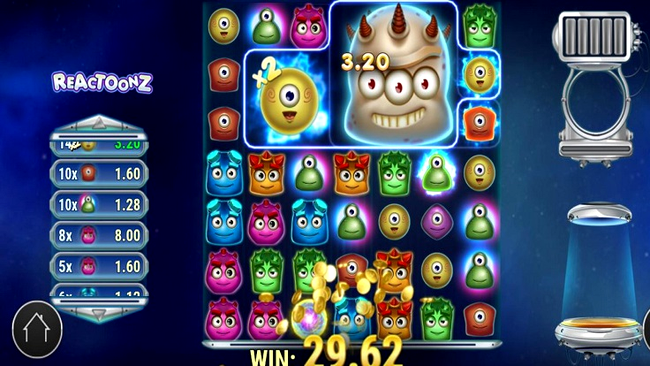 - Reactoonz – este cu extratereștri simplatici. În total sunt 49 de simboluri, iar combinațiile câștigătoare conțin minim 5 simboluri de același fel, indiferent că sunt dispuse pe orizontală sau pe verticală. Cel mai mare câștig este adus de monstrul Gargantoon, care este maroniu, are trei ochi și multe coarne. Jocul are multe funcții speciale, printre care rotirile gratuite care pot genera venituri succesive.