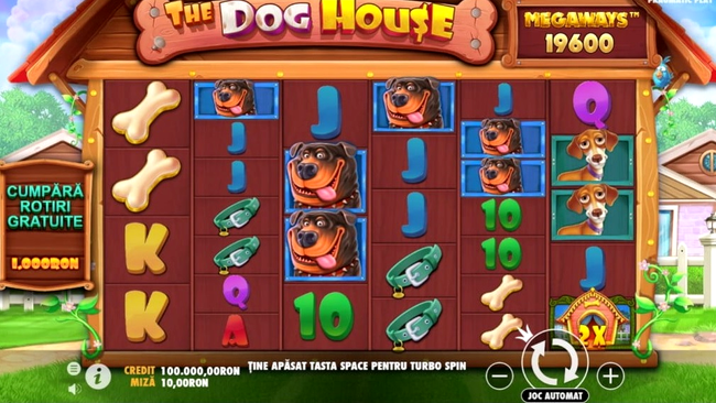 - The Dog House – așa cum sugerează și numele, este un slot în care cele mai multe simboluri sunt imaginile unor câini. Felul în care sunt desenate patrupedele te binedispune, iar starea de bine este cu atât mai accentuată cu cât cățelușii se aliniază astfel încât să ai și câștig. Casa câinelui este simbolul Wild, care înlocuiește orice alt simbol când poate intra în combinații câștigătoare. Lăbuțele de câine sunt simbolurile Bonus. Dacă apar trei pe ecran, atunci beneficiezi de rotiri gratuite. Toate simbolurile plătesc de la stânga la dreapta. Miza minimă este de 0,20 RON.