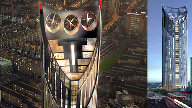 Strata este cel mai inalt turn rezidential din Londra si totodata primul zgarie-nori din lume cu turbine eoliene incorporate.