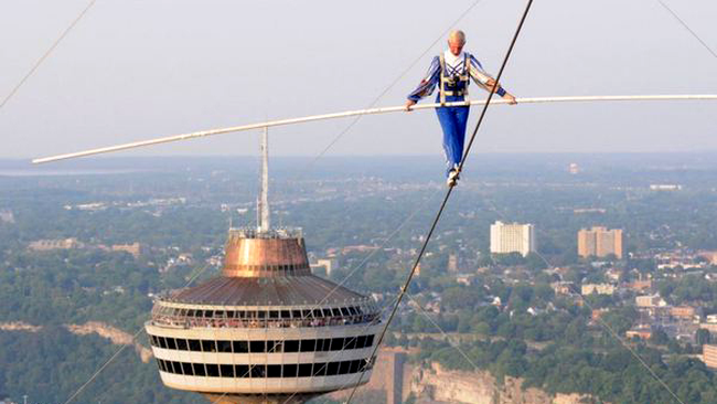 A fost cea mai lungă distanță, de 396 de metri, la cea mai mare înălțime, de 177 metri, parcursă de un om pe frânghie între două clădiri, din istoria Americii de Nord.