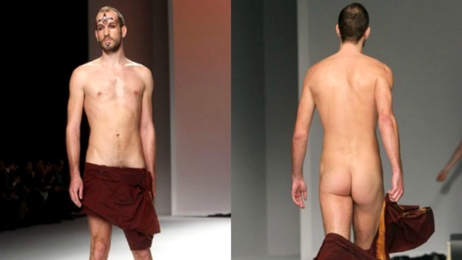 Actorul italian Giuseppe Sartori si-a pierdut singurul obiect vestimentar in timp ce prezenta pentru colectia masculina toamna-iarna 2012 a designer-ului italian Frankie Morello.