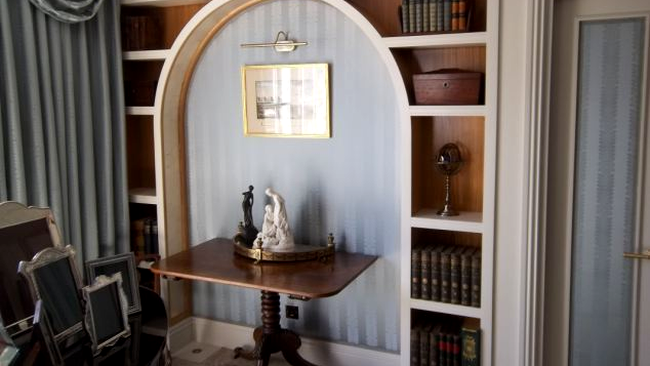 living se afla o biblioteca in care sunt asezate carti vechi, doua